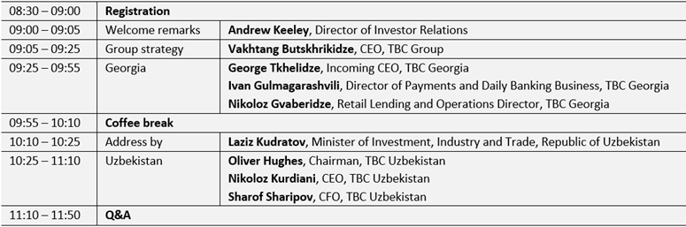 The event will commence at 09:00 (ET), with registration opening at 08:30. The agenda will feature presentations from TBC’s senior management team, including a Group strategy overview, followed by detailed business updates on the Company’s operations in Georgia and Uzbekistan, and financial targets.